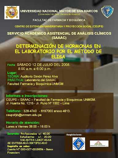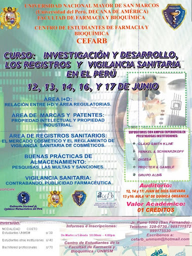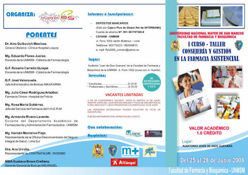 La Promoción Ingresante 2005 de la Facultad de Farmacia y Bioquímica – UNMSM, cuya misión es organizar, desarrollar y liderar eventos de carácter académico para profesionales y estudiantes del área de ciencias de la salud promoviendo la investigación y trabajo en equipo, organiza el I Curso – Taller: GESTIÓN Y CONSEJERÍA EN LA FARMACIA ASISTENCIAL , invitando a todos los profesionales y estudiantes del área de la salud a formar parte de este gran evento, el cual esperamos cubra con todas las expectativas.Por ello hemos visto conveniente reunir a destacados profesionales de alta calidad comprometidos a brindar sus experiencias y conocimientos para este gran evento, y así poder contribuir como fuente de capacitación tanto de